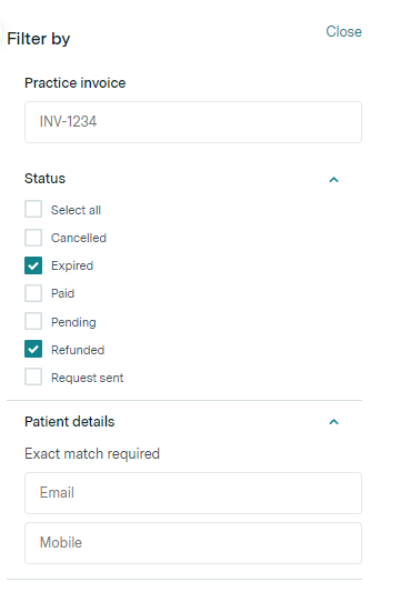 - Filters exist to help you manage your requests so you can narrow down requests by status, and you can search for specific invoices or patients if you wish to see specific information relating to a specific person