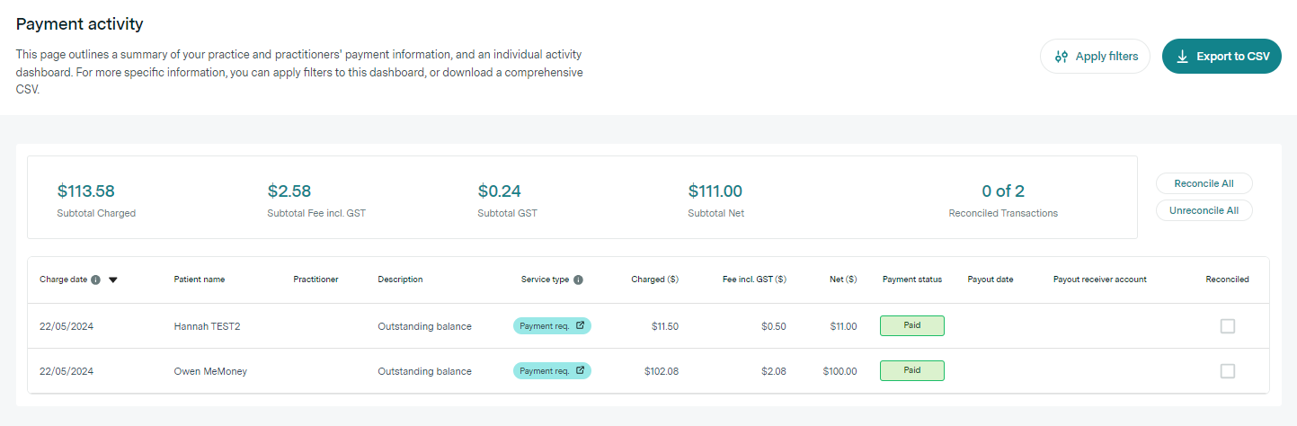 - Once successfully paid, the payee sees a confirmation screen, and receives a payment confirmation receipt separately. The status in Practice Admin updates as well to reflect the payment, and the request is now shown in the reconciliation payment activity page, under the service type "Payment req."