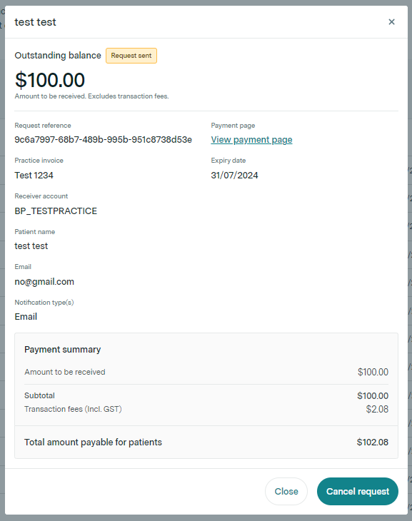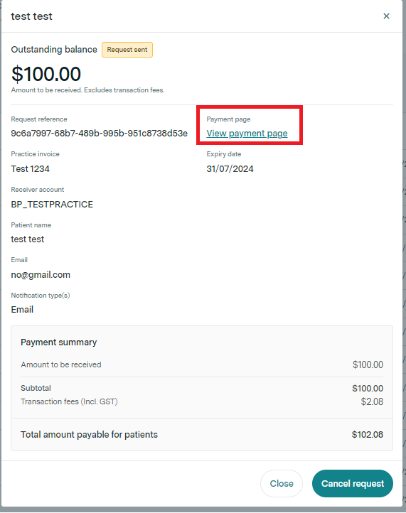 Once you have generated the payment request and the status is set to "request sent", you can click the details eye icon to open up the payment request. There is a section here called "Payment page" and if you copy the link, or open the hyperlinked page you can retrieve the URL for the patient's payment