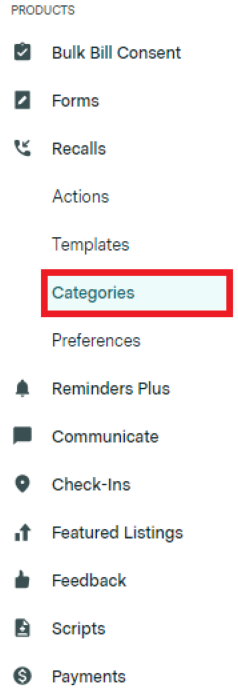 To set up your Recalls categories, navigate to the ‘Categories’ page within the ‘Recalls’ menu in Practice Admin.