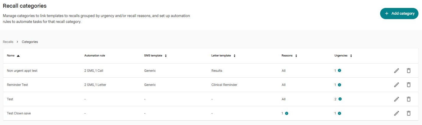 The Recalls 'Categories' feature allows you to group multiple recall reasons into one ‘category’. An SMS template and a letter template can then be associated with each category, allowing you to skip the step of manually selecting or creating a recall template when sending recalls.