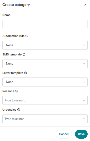 You may wish to come back to this step later once you’ve decided what categories you want and make relevant SMS and letter templates accordingly. Note that a category will not work without an SMS and letter template, so don’t forget to come back and do this at some stage if you don’t do it now.