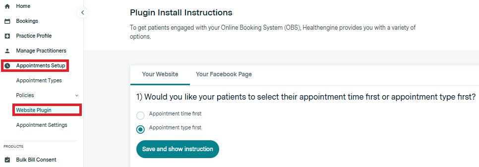 Log in to your Practice Admin portal and navigate to Appointments Setup -> Website Plugin