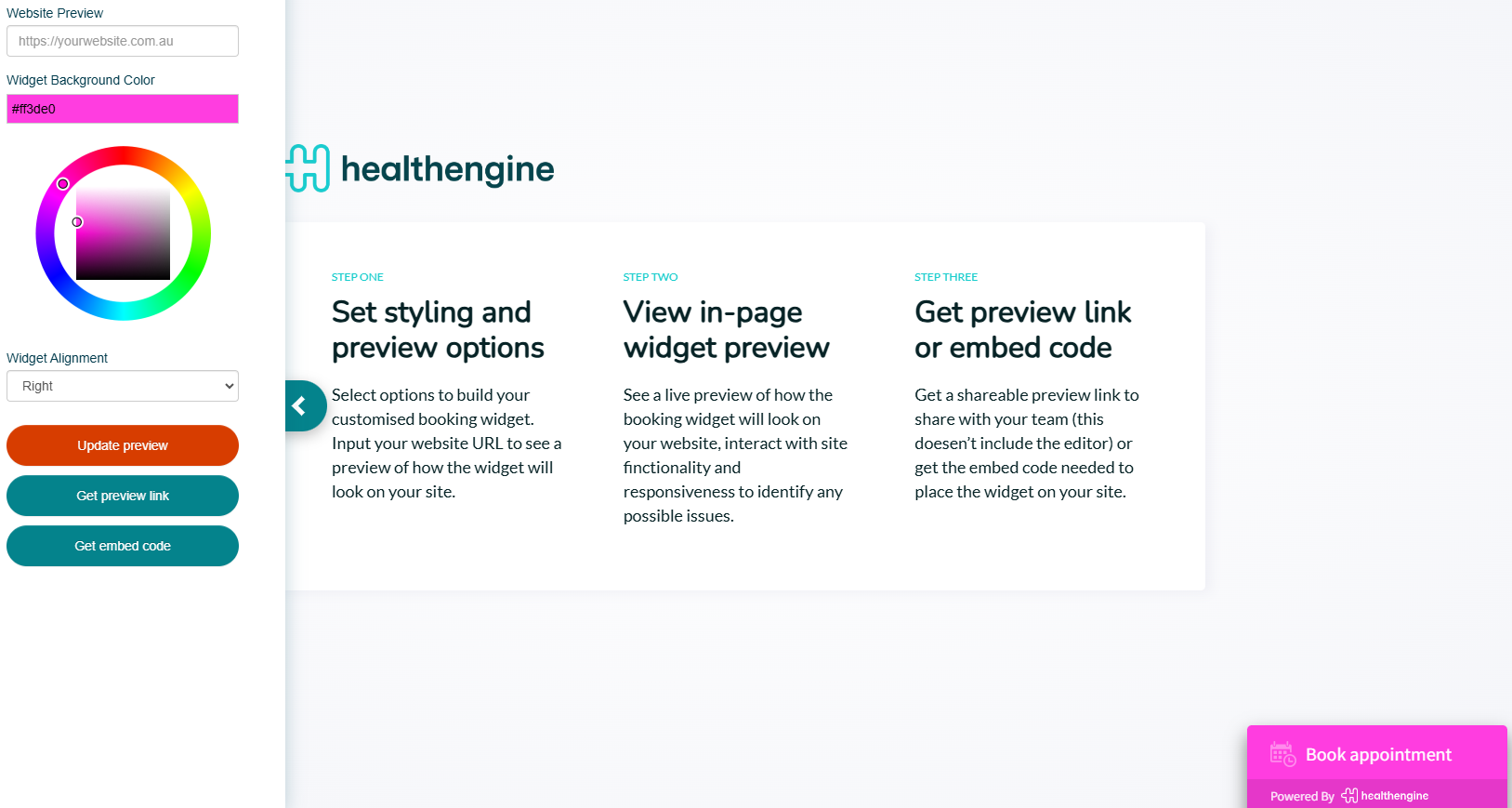 You can add your website to the website preview box and then enter or select a colour from the colour wheel and choose your preferred widget alignment. When you hit update preview, it will adjust the web plugin you see on the page to your preferences. You can then click Get Embed Code to get your web plugin script you will need to send to your web developer.