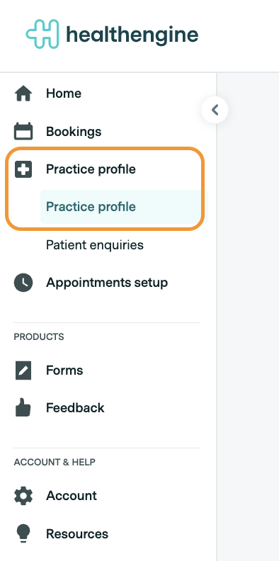 Groups that have the Healthengine Professional Profile feature as part of their PAMS package will be able to access the 'Practice profile' tab and edit information on their public profile as shown below: