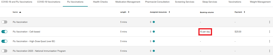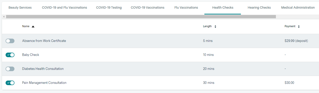 Appointment types that are enabled are what patients will see online - it's important to toggle these on when your practice is ready to have these services booked online.
