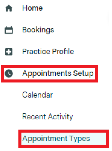 To manage your appointment types and specialties, simply navigate to "Appointments Setup" and then click on "Appointment Types" in your Practice Admin.