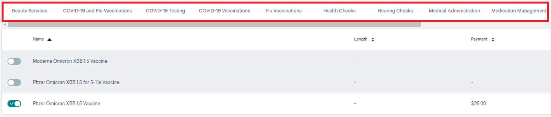 To make an entire service unavailable for online bookings, toggle off all appointment types linked to its service, as seen below: