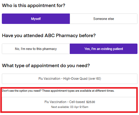 Once the stock limit has been reached, the option to book the appointment type will be automatically removed from the patient-facing system. The patient will be shown the next available date and time for the service.