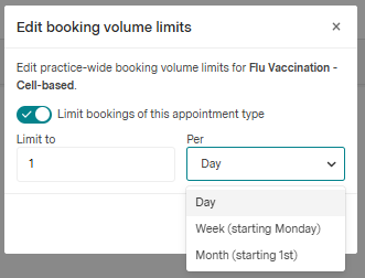 Once in here, enable the toggle to limit the bookings for the appointment type you have chosen, and you can then set a limit for how many bookings can be made for the chosen appointment type in a day, week or month.