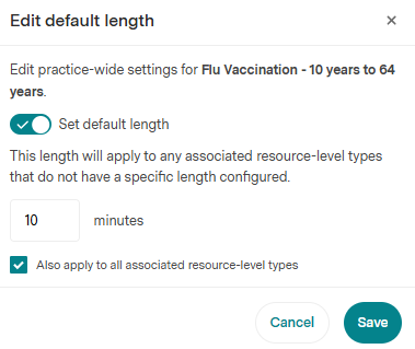 Once in here, you can nominate a new appointment type length and apply this to all relevant Consultation Rooms (otherwise known as associated resources).