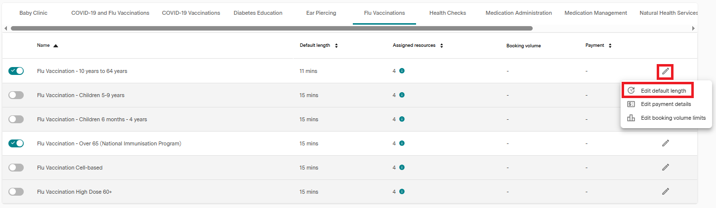 To edit the default length of an appointment type, locate it under the relevant specialty heading and select the pencil icon.