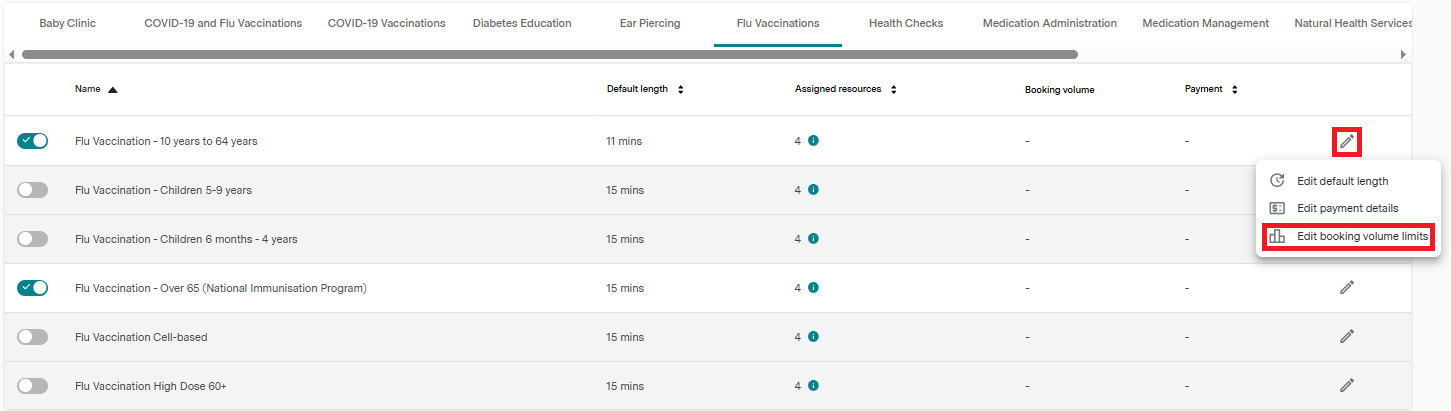 Locate the service and appointment type you wish to manage the volumes for, and select the pencil icon. Here you will see the option to 'Edit booking volume limits'.