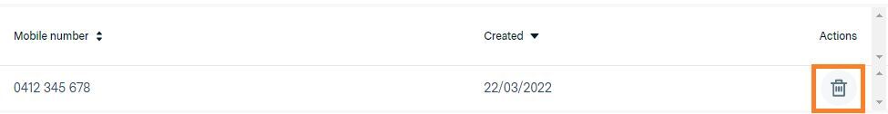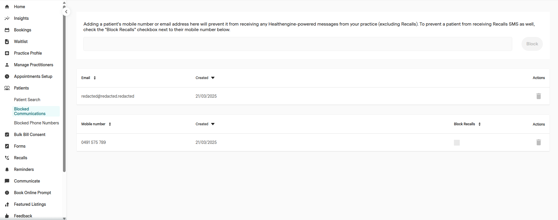 If you wish to remove a mobile number or email from the block list, simply select the trash can icon in line with the patient's form of communication. Following this, the patient will be able to receive any future communication.