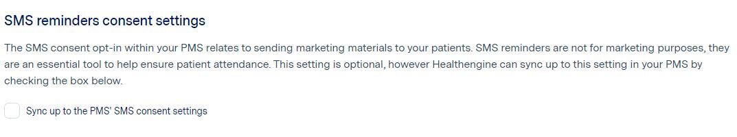 In the latest versions of Best Practice, the software does not allow third-party access to consent settings. What this means is that settings that have the ability to read consent settings from your own PMS (like the one shown below in Reminders) will not be able to do so.
