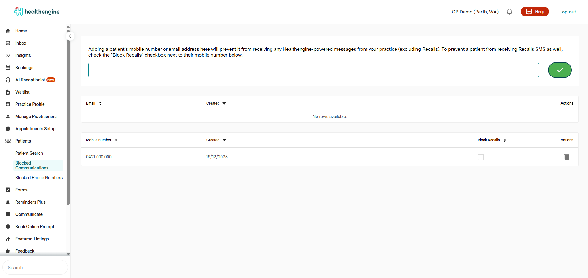 In this Blocked communications list, you can add a patient's email address and/or mobile phone number to block it from receiving communications from Healthengine.