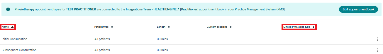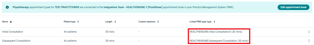 Once you have selected your practitioner, you'll see their list of appointment types. The Healthengine appointment types will appear under the 'Name' column, and your Nookal services will show under 'Linked PMS appt. type' once set.