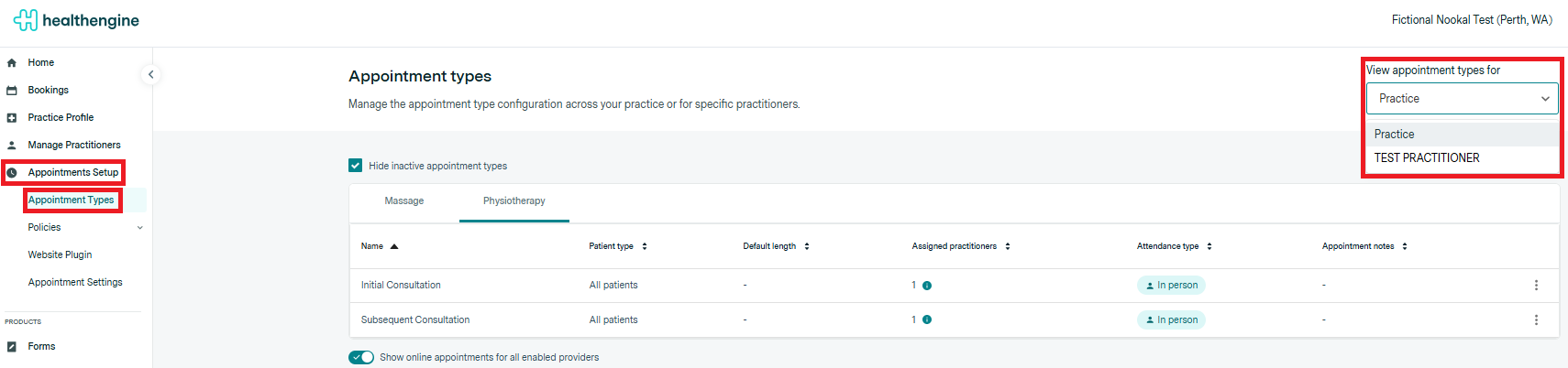 Once you are in here, you will need to select the relevant practitioner you want to link up the services for. This is done in the top right corner under 'View appointment types for...' - simply click into this drop-down and select the relevant practitioner.