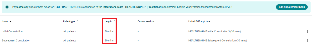 You also need to ensure that the appointment type length in Healthengine matches the length of the Nookal service you are linking it to. In Nookal, this is known as duration.