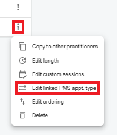 Once in here, you will see a list of their Healthengine appointment types. Click on the 3 dots at the end of the row on the appointment type you wish to edit. Select 'Edit linked PMS appt. type', which will then bring up a drop-down containing your Nookal services.