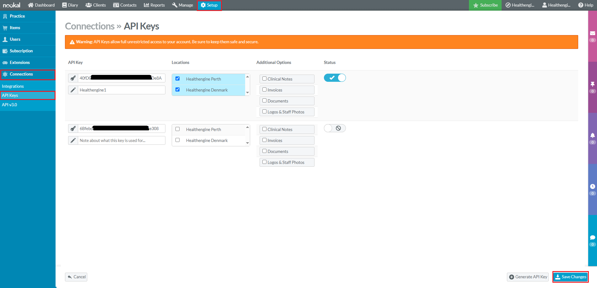 To create a new API key or to replace an API key from Nookal, you will need to log in to Nookal, click on Setup > Connections > API Keys and click Generate API Key.