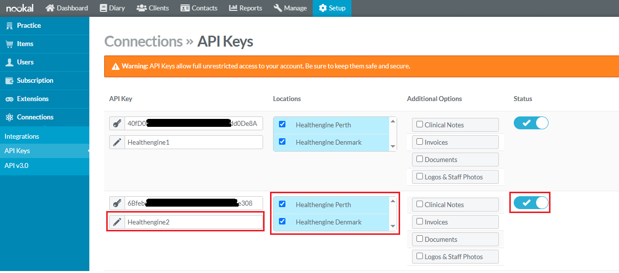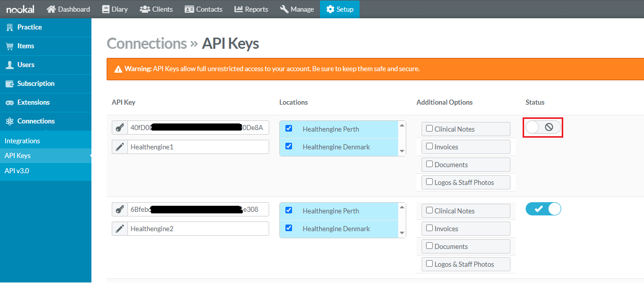 Now that it's up and running, you can go back and disable the old/previous Healthengine API key via Setup > Connections > API Keys as outlined in the first two steps and toggle the previous key to Key Disabled and click Save Changes down the bottom right.