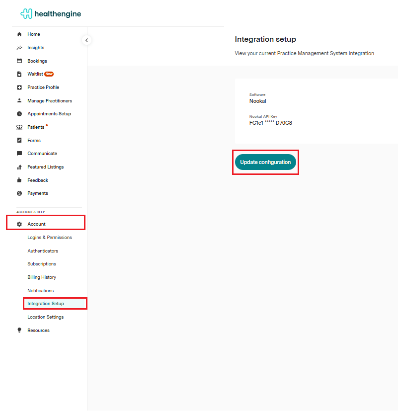 Now that you have your API key, you will need to log in to Practice Admin, and browse to Account and then Integration Setup Account > Integration Setup and click on Update configuration