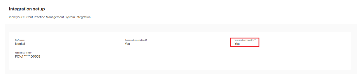 Congratulations, you have now updated your API key from Nookal into your Healthengine profile. You can confirm this is up and running by refreshing the Integration Setup page after a few moments, and you should see Integration Healthy? show as Yes.