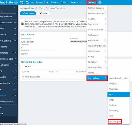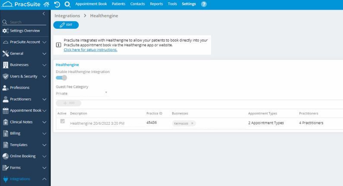 In PracSuite, go to Settings > Integrations > Click into Healthengine.
