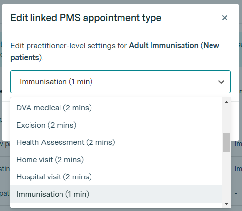 Select the 3 dots on the row of the appointment type you wish to edit, and click into 'Edit PMS Appointment Type. It's here you'll be able to select the relevant one from the drop-down menu that appears.