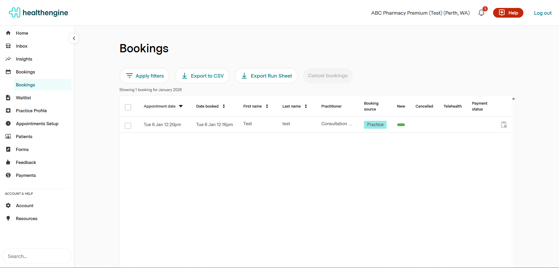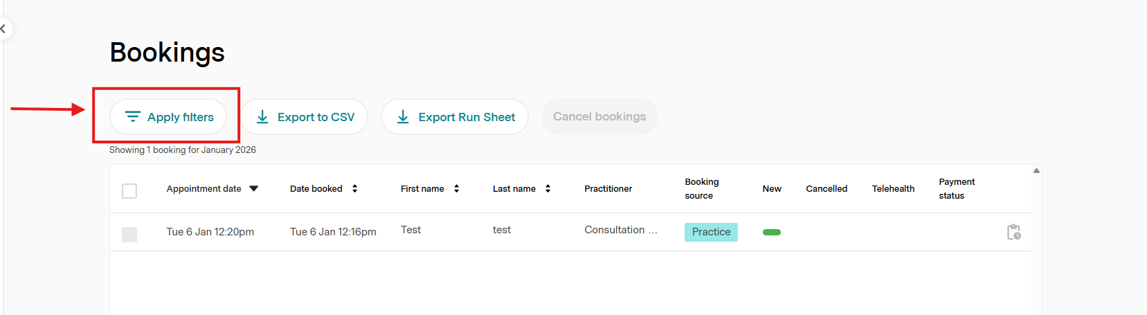 To access this page, navigate to the 'Bookings' tab in your Practice Admin portal.