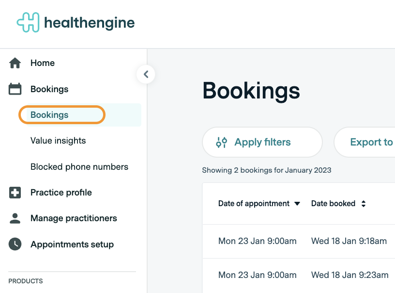 The Bookings section of your Practice Admin is where we keep a record of all your bookings made on Healthengine! From this section of Practice Admin, you can review any upcoming or past appointments and view patient details.