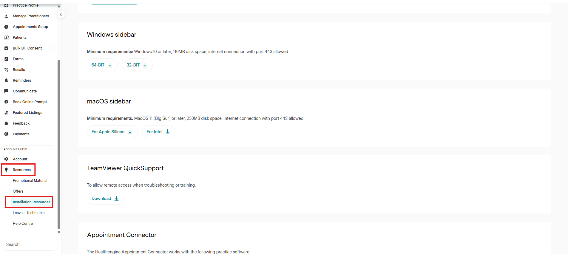 This section provides download links for our sidebar, TeamViewer Quicksupport and the appointment connector.