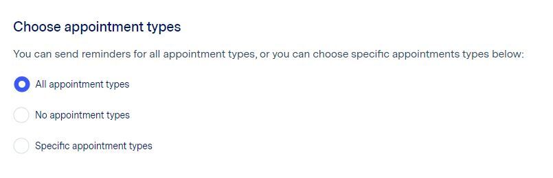 The 'Choose Appointment Types' setting in Reminders Plus Preferences allows you to choose which reminders are sent out for specific appointment types. Like with choosing a practitioner or location, you can select all for reminders to be sent out for all appointment types.