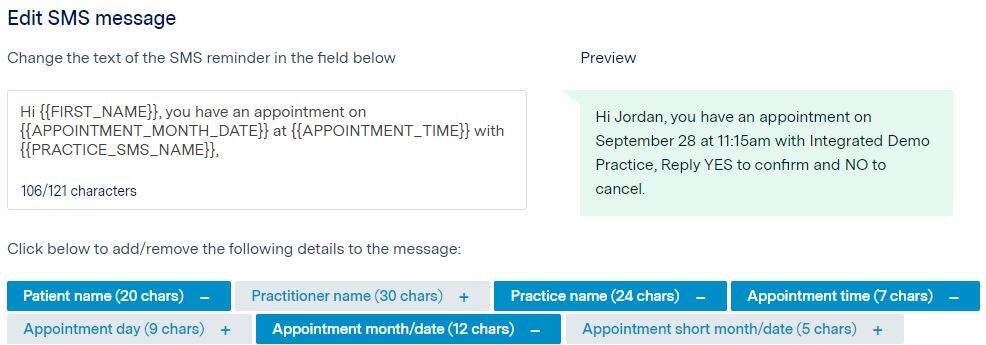 Here, you can edit what is written in your SMS reminder. Please ensure you use the buttons to add names and times rather than hard-coding this in by free-typing, as the reminder cannot be customised any other way.