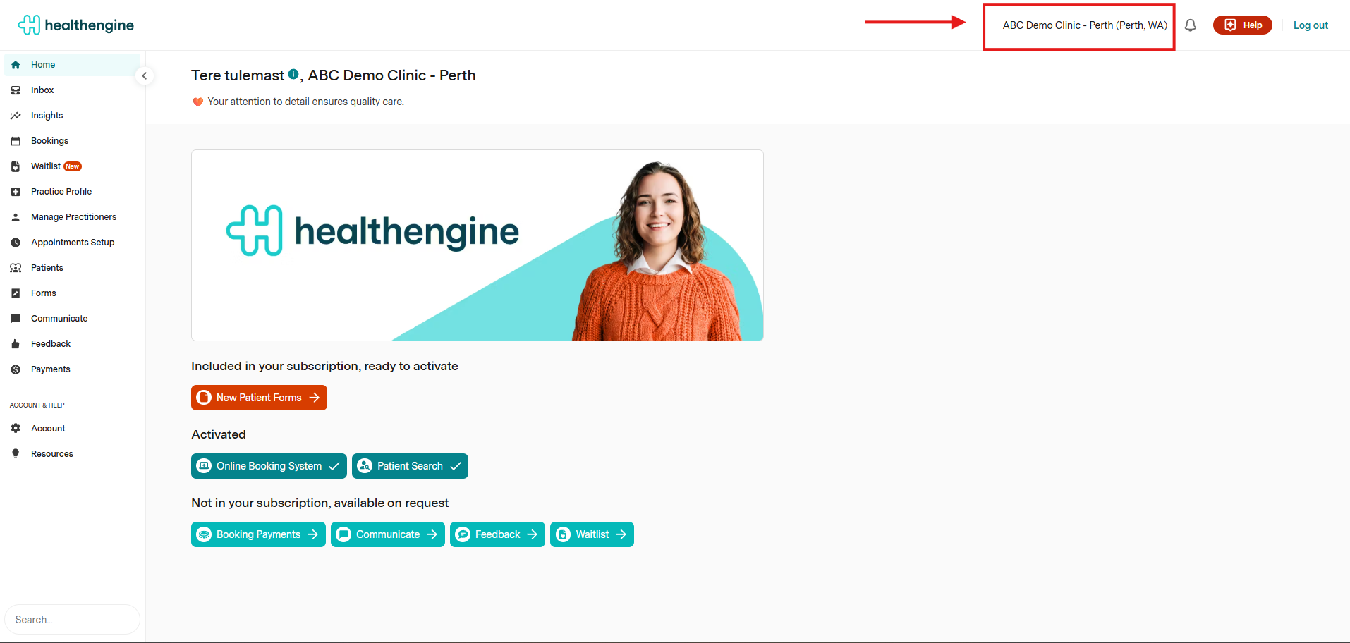 If this is the case, simply log in with your existing Practice Admin login and select your new location using the drop-down in the top right-hand corner, select the name of the practice and a drop-down menu will appear for you to select the right location.