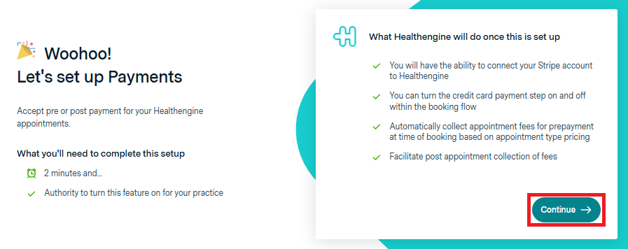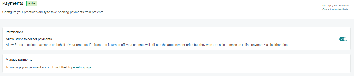 To access your Stripe account from within Healthengine, click where it says 'Stripe setup page' under Manage Payments.