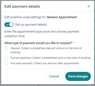 - Please Note: You can set up different payment collection methods for different appointment types.