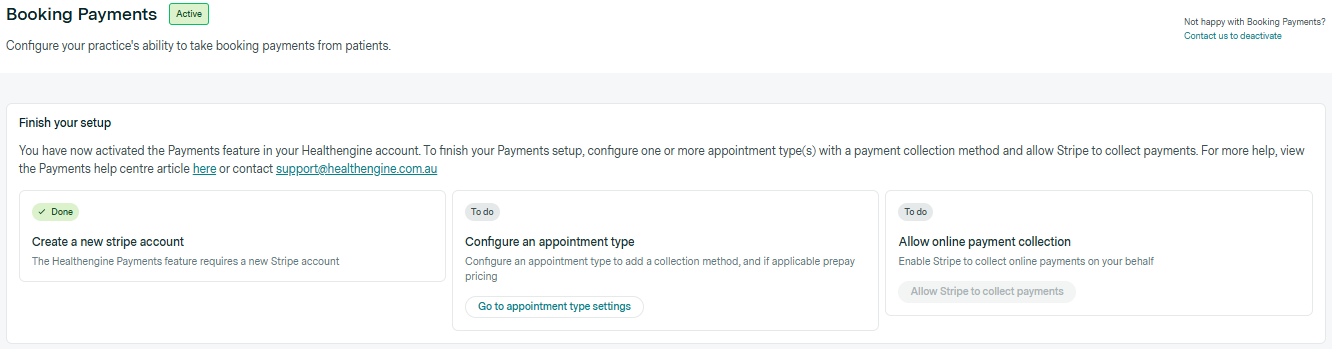 Healthengine has partnered with Stripe Payments to allow for your practice and practitioners to automatically collect deposits & pre-payments, and manually collect post-payments for suitable bookings. You can activate this product via Practice Admin using the following steps:
