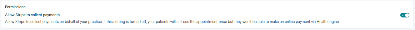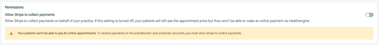 Make sure the "Allow Stripe to collect payments" toggle is set to on (teal, with a tick) - the yellow warning message should disappear to show that your practice is set up correctly.