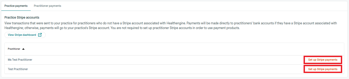 To set up individual practitioner accounts, navigate back to the Payments tab, and click where it says 'Stripe setup page' under Manage Payments.