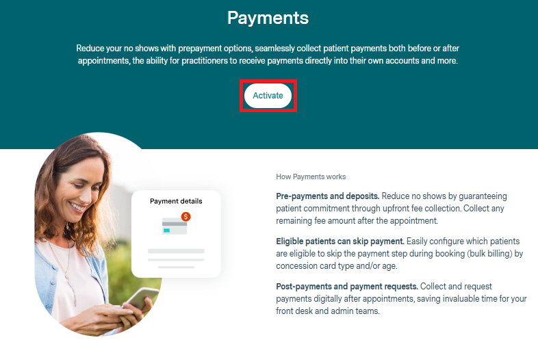 - Post payment - which requires a patient to enter their card details and have their card checked as valid card in order to make a booking, and then post appointment have their appointment fee manually collected,