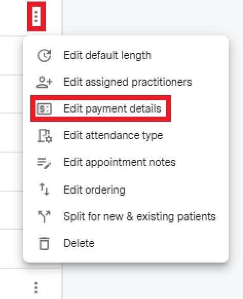In the row of the relevant appointment type you want to add a payment to, click the three dots, then select 'Edit payment details'.