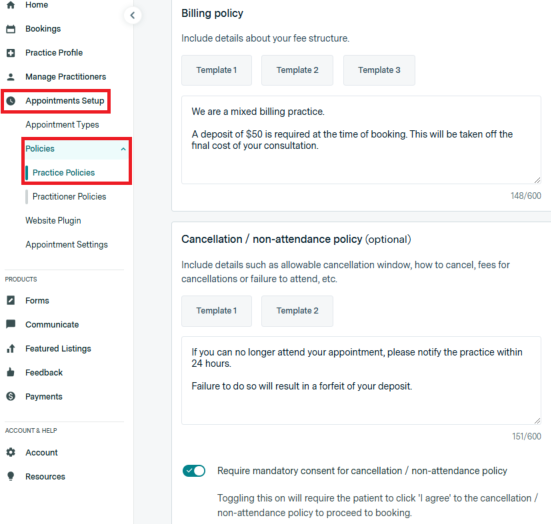 It is recommended that you also update your billing policy and cancellation policy information in your practice’s booking form to reflect the payments process to ensure your patients have the best booking experience, and to minimise any complaints with regards to Did Not Attend or late cancellation fees.