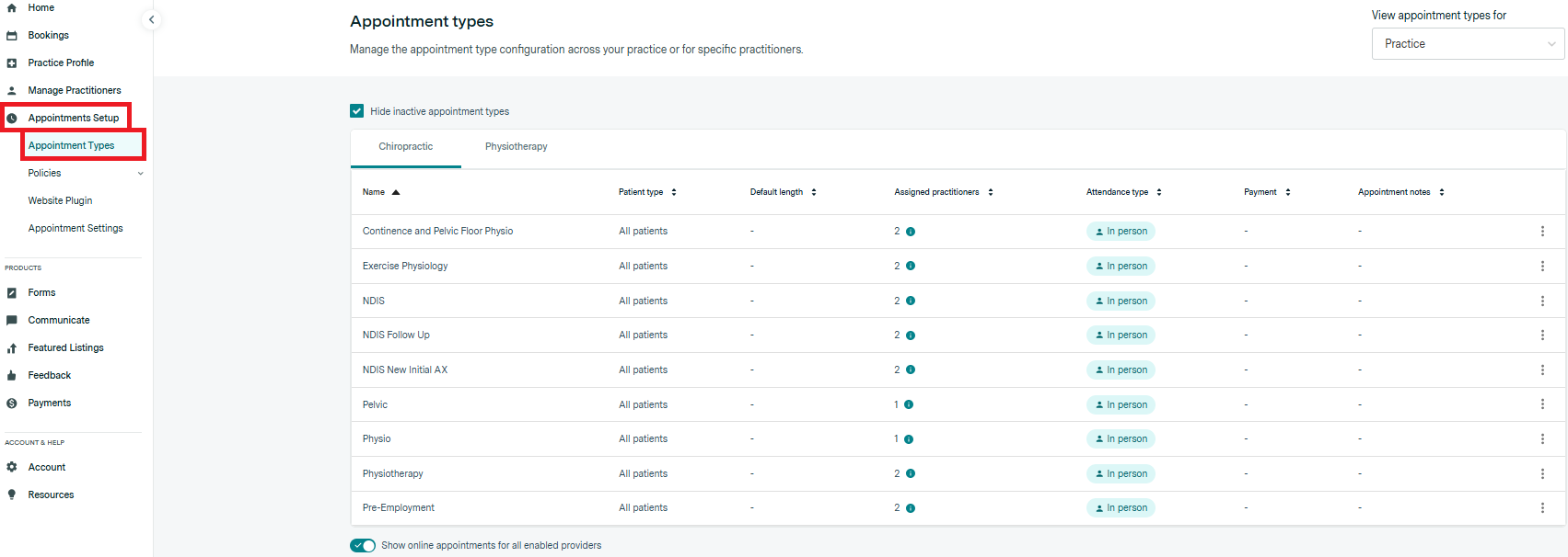 To set these settings up, go to the Appointment Types tab in Practice Admin.
