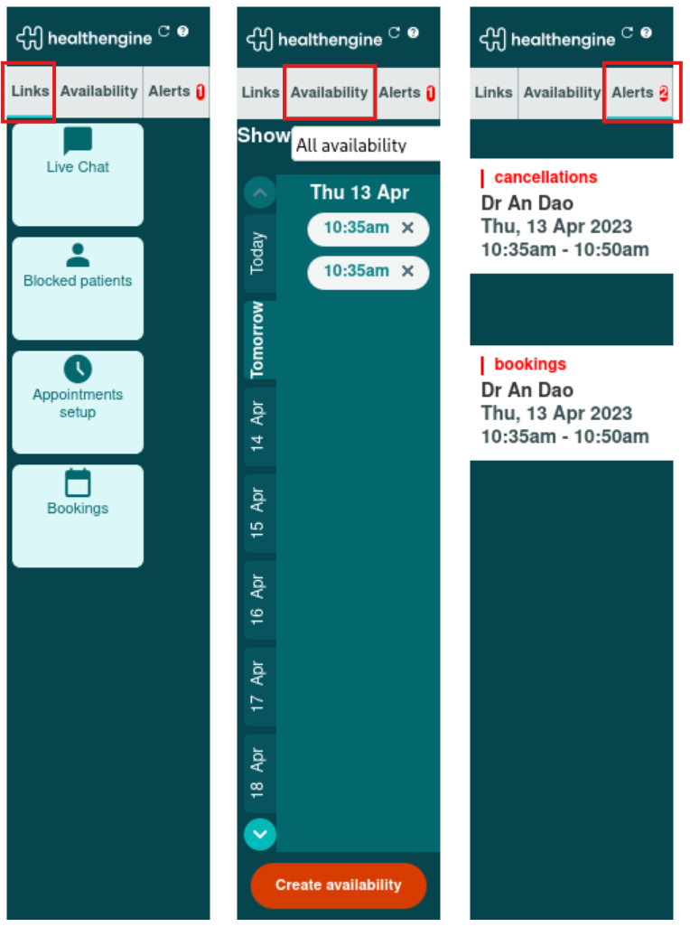 The sidebar has 3 individual tabs to manage the different functions we have in Sidebar: icon links to Practice Admin pages, managing and viewing availability, and alert notifications for bookings and cancellations.