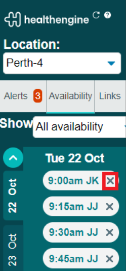 To remove availability, simply find the available time you wish to remove and click the 'X' button next to it, as seen in the image below. Please wait a moment for the time to disappear from the Sidebar screen, and then it will also be removed from the Healthengine website.