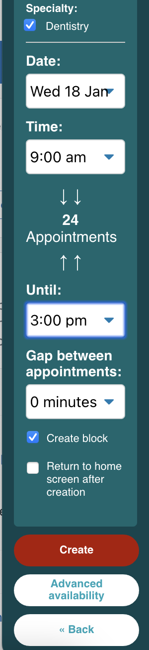 Following this, you simply need to select 'Create' to finalise these appointment slots and click 'Back' when finished.