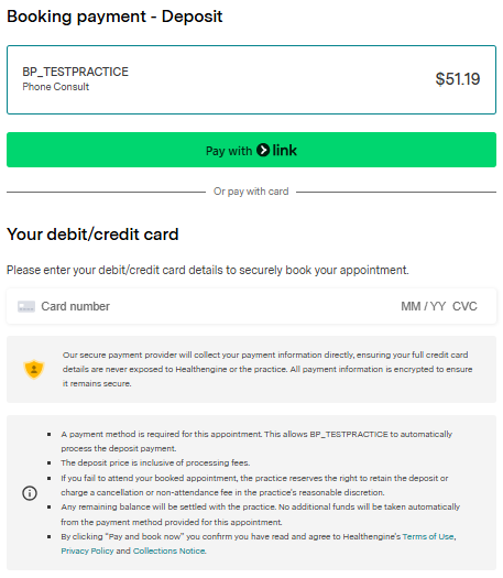This flow outlines what a patient will see for pre-payment and post-payment bookings on the Healthengine website, or via your Healthengine Online Booking System if your practice has the Payments feature enabled. For guidance on setting up Payments, please view the relevant article here.