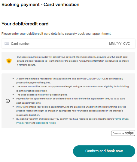 A patient enters their credit card details, and clicks “Confirm and book now”